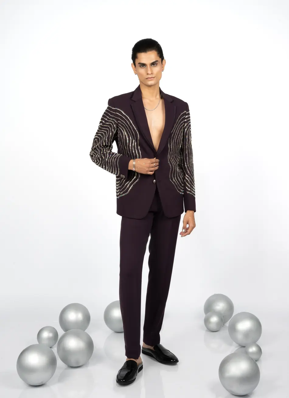 Wine Shimmer Abyss Metal Embroidered Blazer.