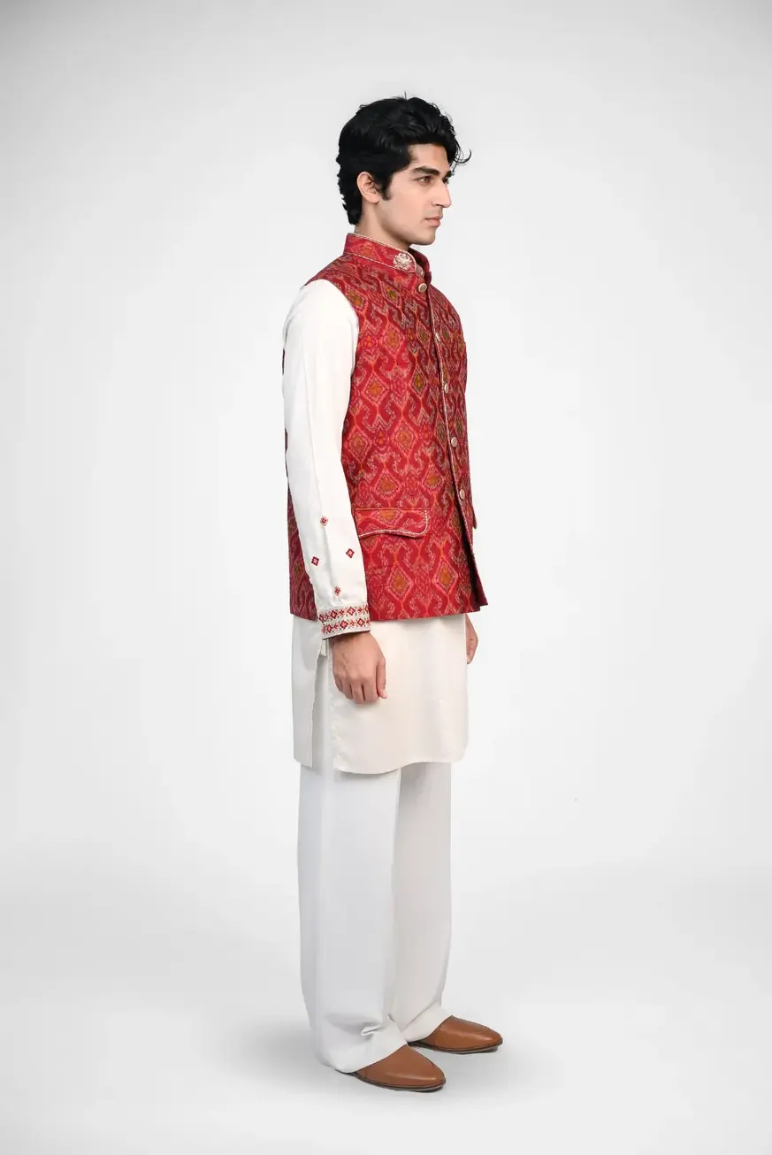Red Ikat Bandi With Embroidery On The Collar And Stitch Line Details.