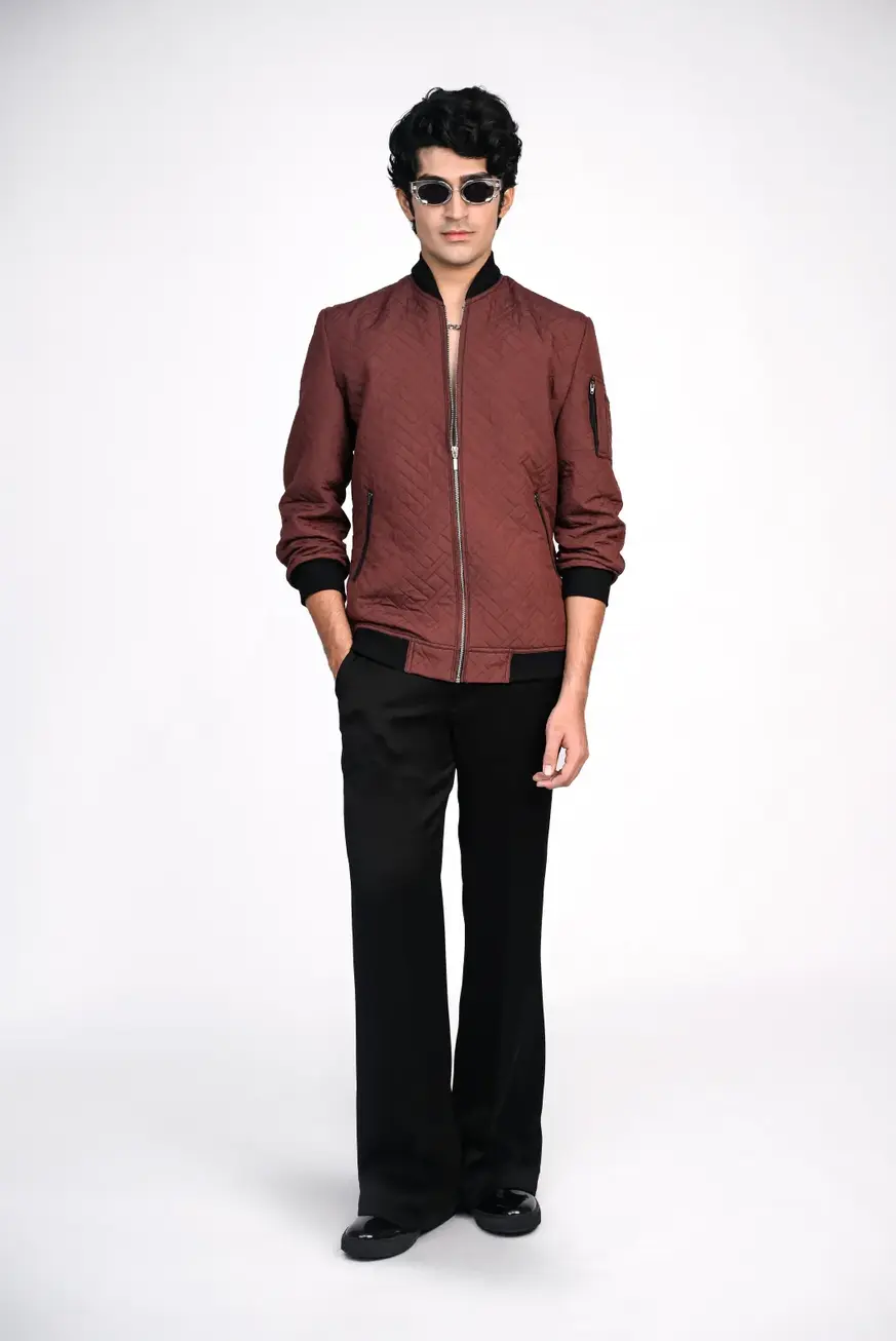 Rust Self Quilted Bomber Jacket With Pocket Details On The Sleeves.